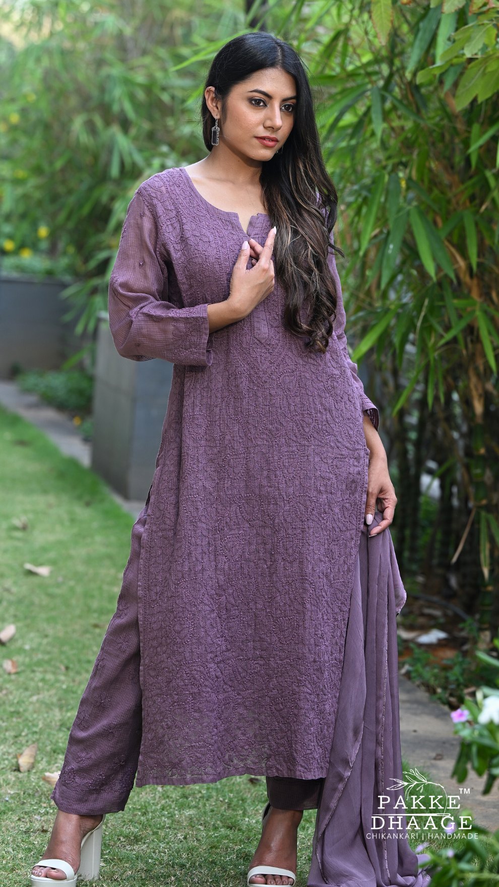 The fusion of Kota Doria's delicate, airy weave with the intricate artistry of Chikanakri embroidery creates truly exquisite ensembles. Elegant and comfortable for all seasons, these sets define the true beauty of handmade. The kurta has full jaal pattern of hand work in the front and beautiful booties at the back. Paired with a pure Kota Doria pant and a soft, flowy chiffon dupatta to complete the look.