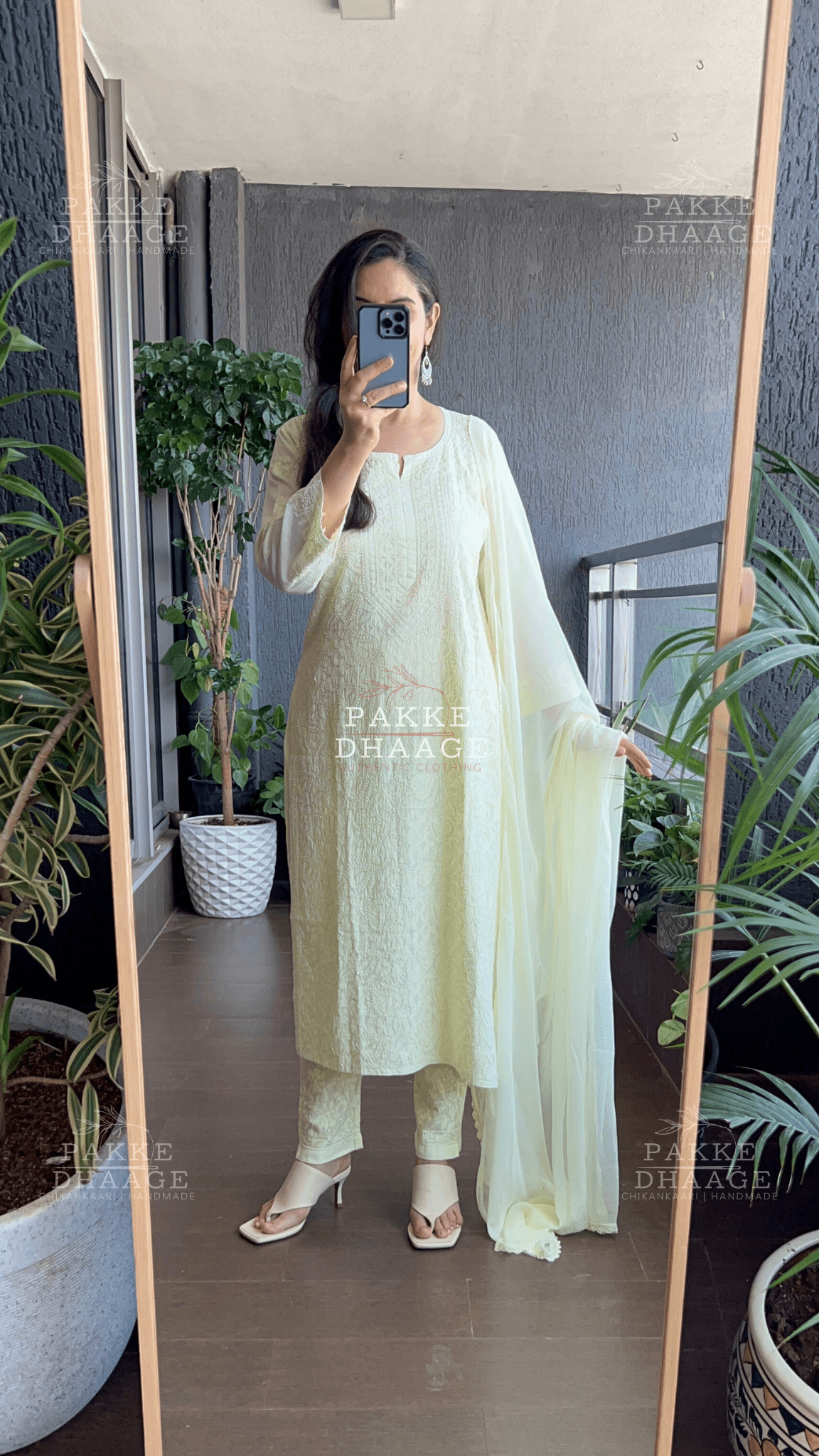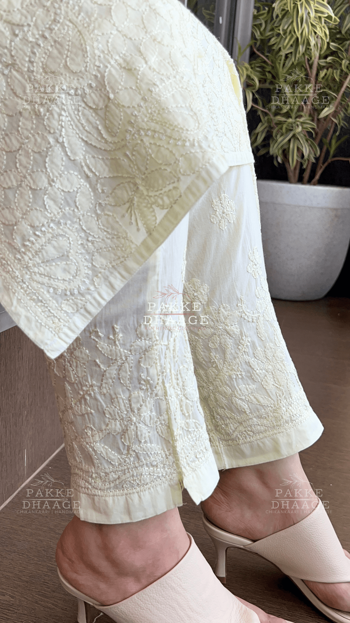 Indulge in the unparalleled elegance of Resham Dhaaga Mulmul collection. Made from the finest Mulmul in soft pastel hues, this ensemble exudes charm and grace, perfect for any celebration or a special event. Intricate Chikankari motifs, stitched with self resham dhaaga, adorn the front with scattered booties at the back and on sleeves. Even the pants whisper of sophistication with Chikankari work gracing the hems. Tie the whole look together with a luxuriously soft Chiffon dupatta.