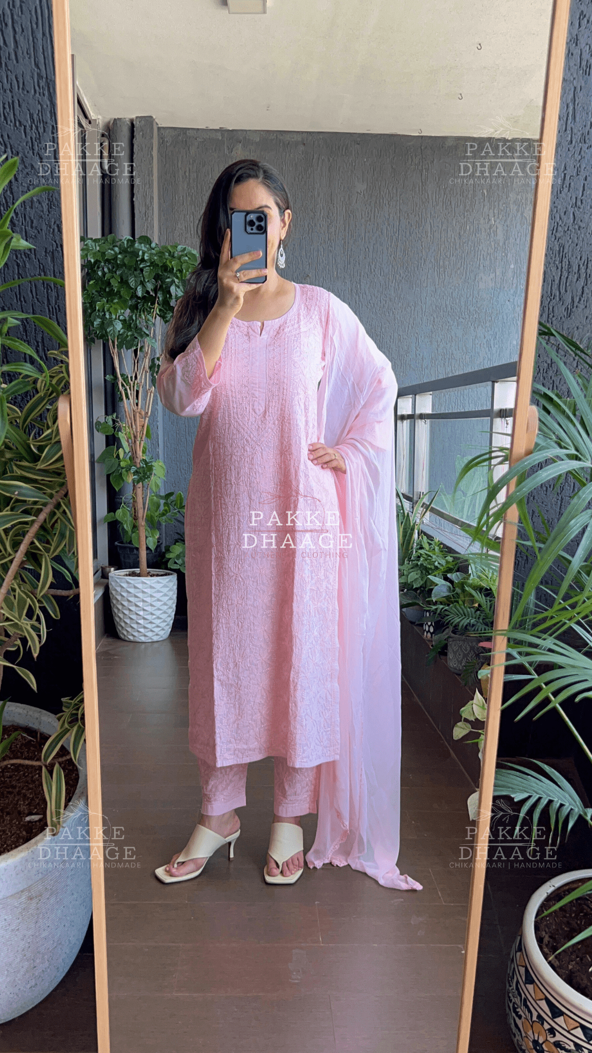 Indulge in the unparalleled elegance of Resham Dhaaga Mulmul collection. Made from the finest Mulmul in soft pastel hues, this ensemble exudes charm and grace, perfect for any celebration or a special event. Intricate Chikankari motifs, stitched with self resham dhaaga, adorn the front with scattered booties at the back and on sleeves. Even the pants whisper of sophistication with Chikankari work gracing the hems. Tie the whole look together with a luxuriously soft Chiffon dupatta.