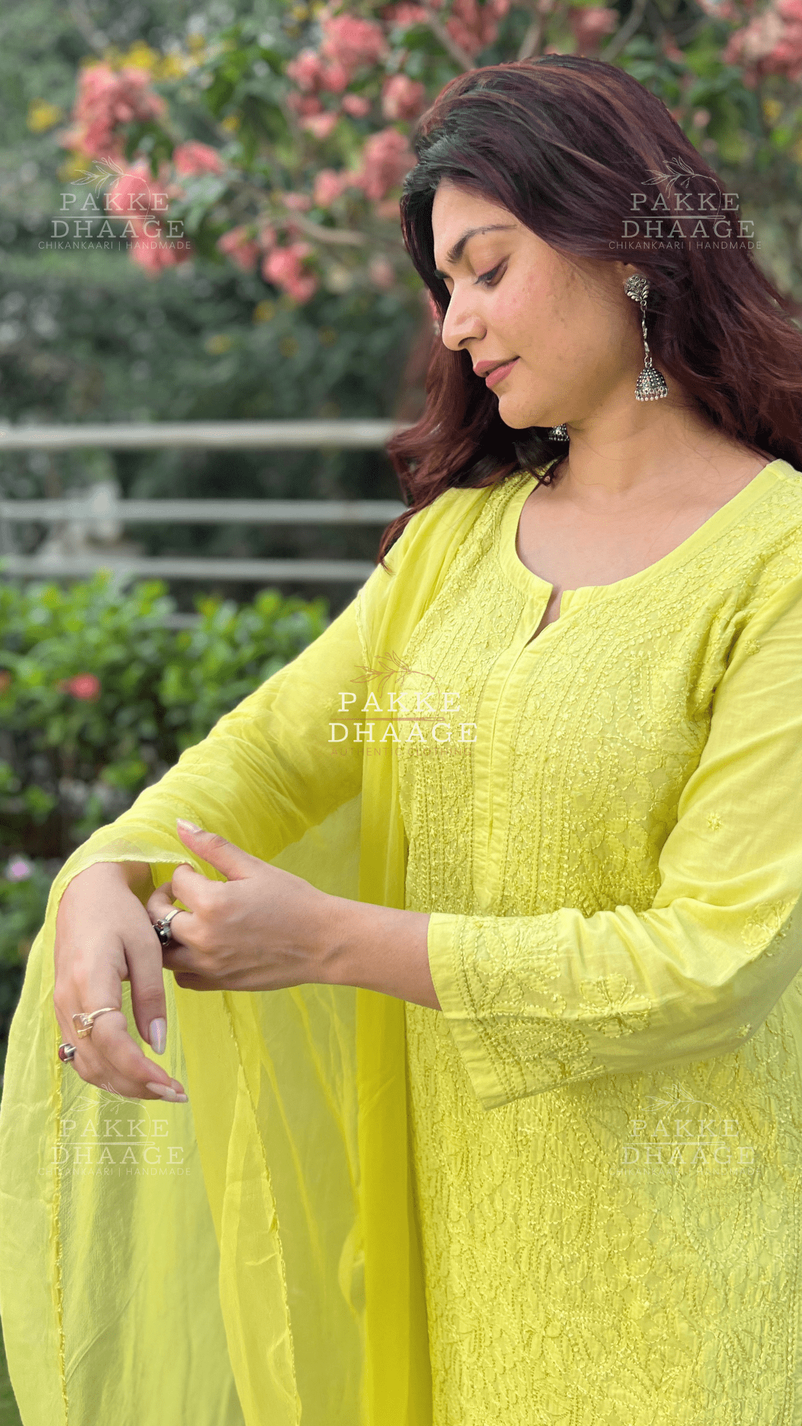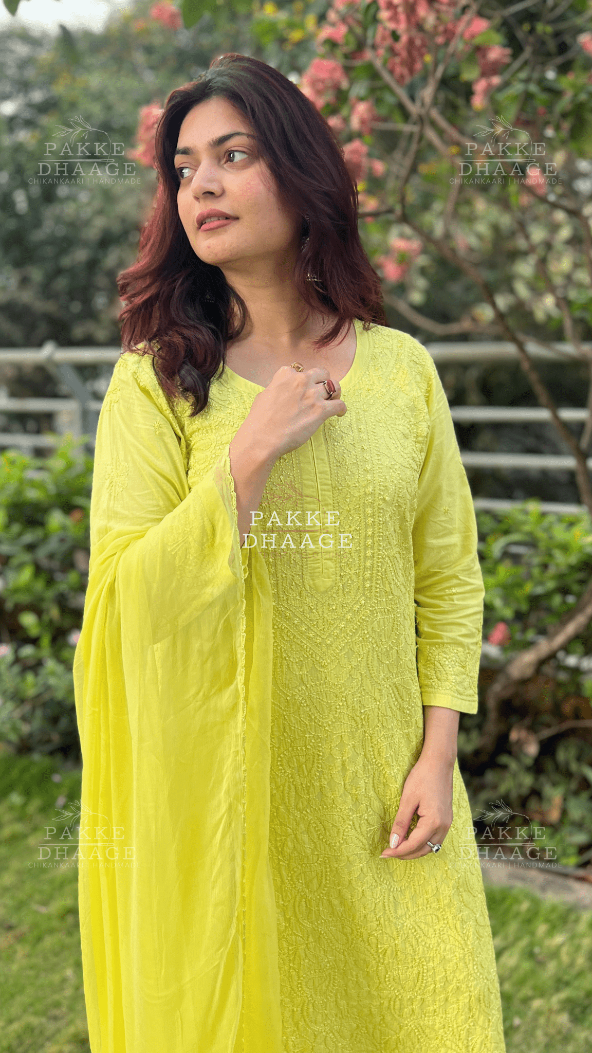 Inayat Resham Dhaaga Mulmul Kurta & Kurta Sets - Lemon Green