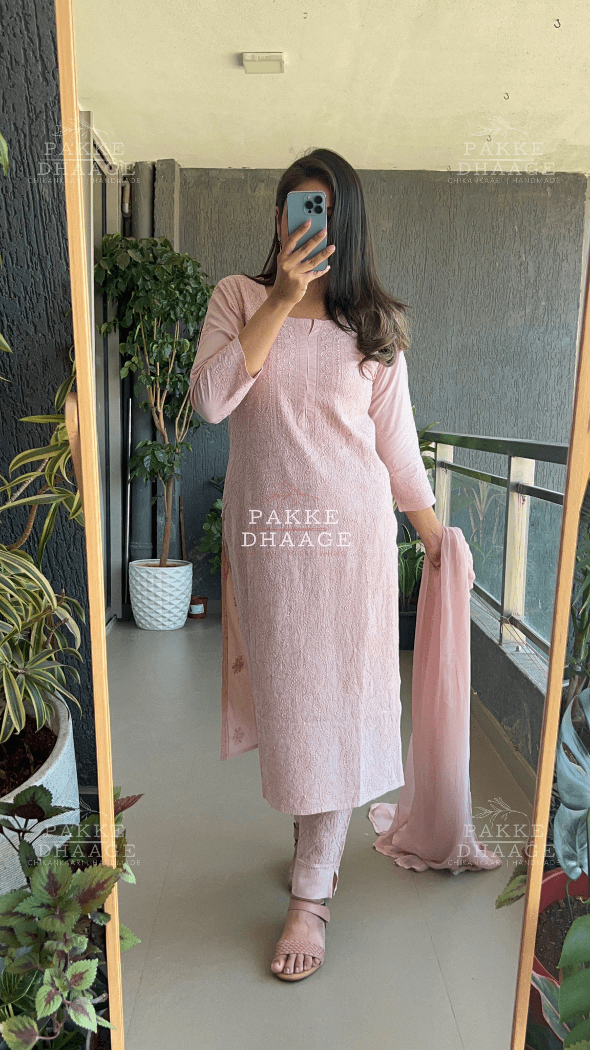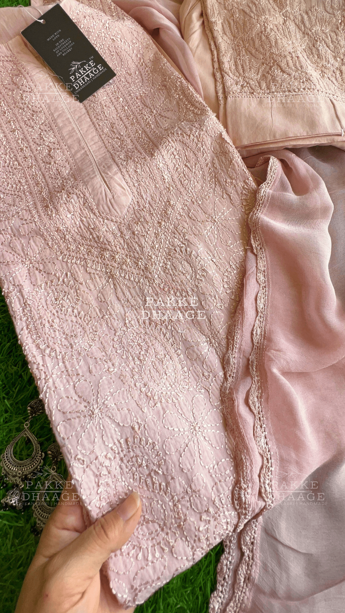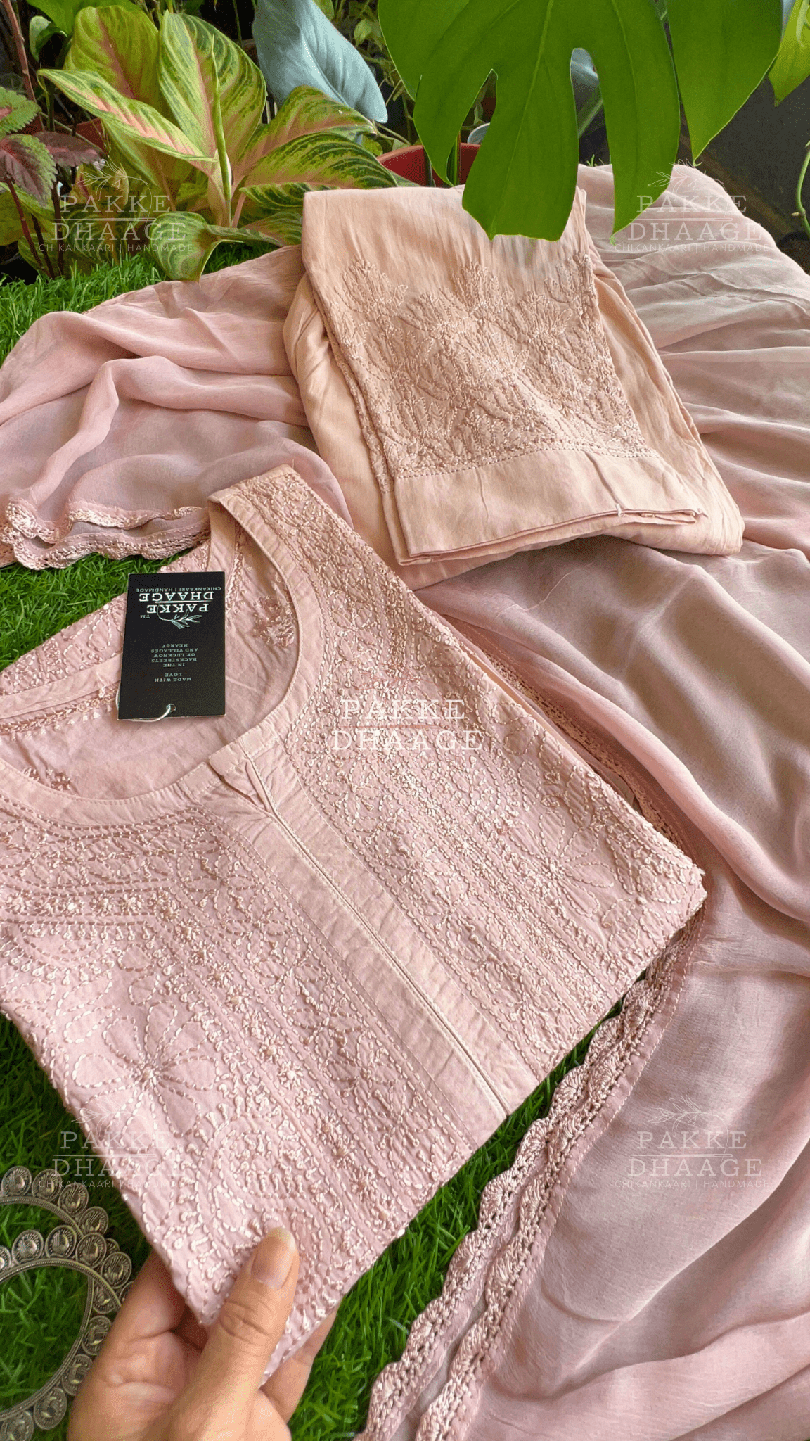 Indulge in the unparalleled elegance of Resham Dhaaga Mulmul collection. Made from the finest Mulmul in soft pastel hues, this ensemble exudes charm and grace, perfect for any celebration or a special event. Intricate Chikankari motifs, stitched with self resham dhaaga, adorn the front with scattered booties at the back and on sleeves. Even the pants whisper of sophistication with Chikankari work gracing the hems. Tie the whole look together with a luxuriously soft Chiffon dupatta.