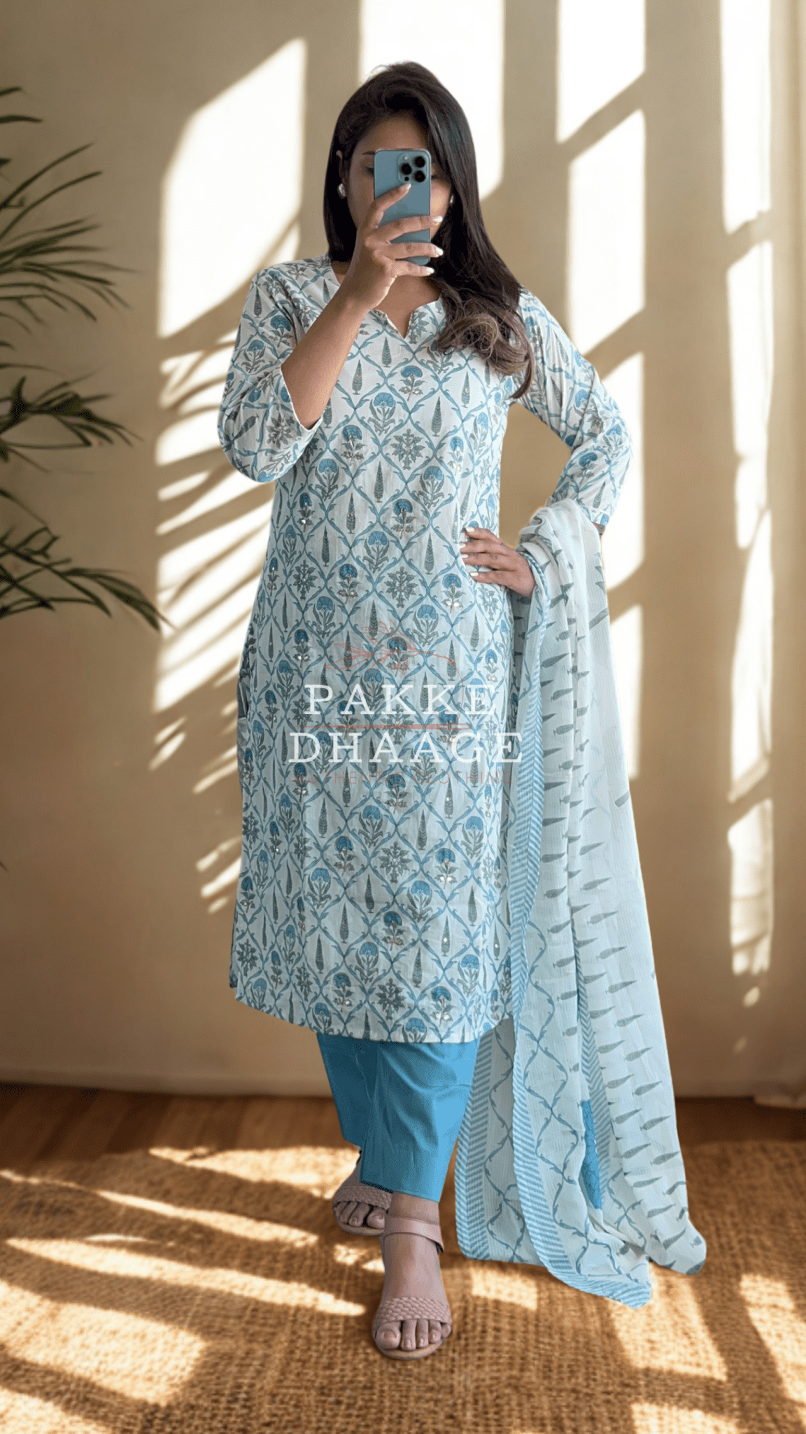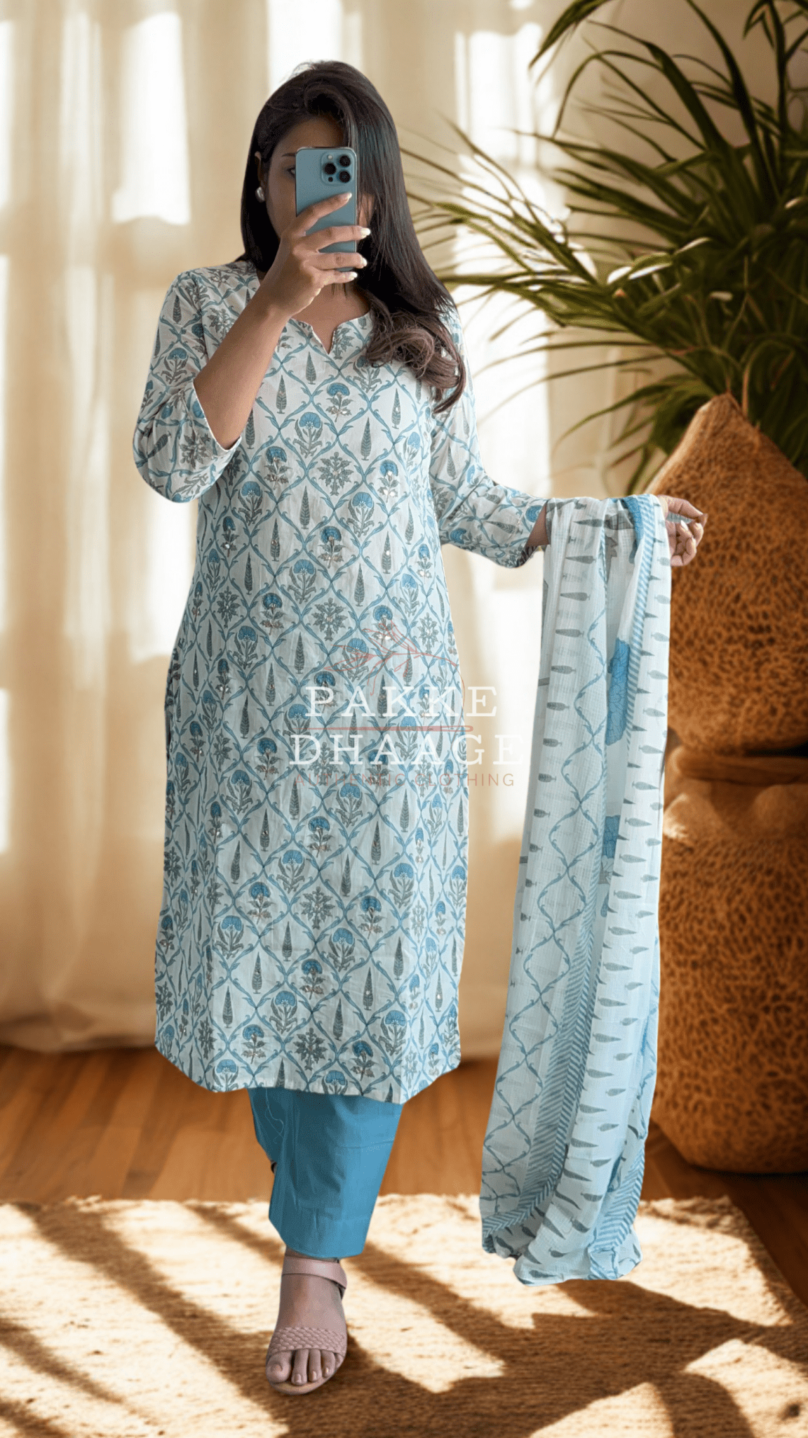 Maharani Threads 3 Pc Printed Cotton Suit with Gotta-Patti & Kota Doria Duppatta - Sky Blue