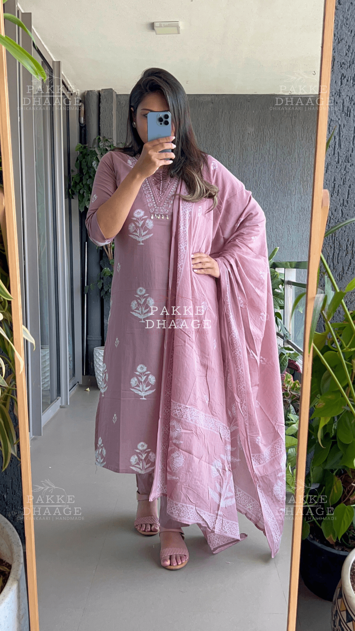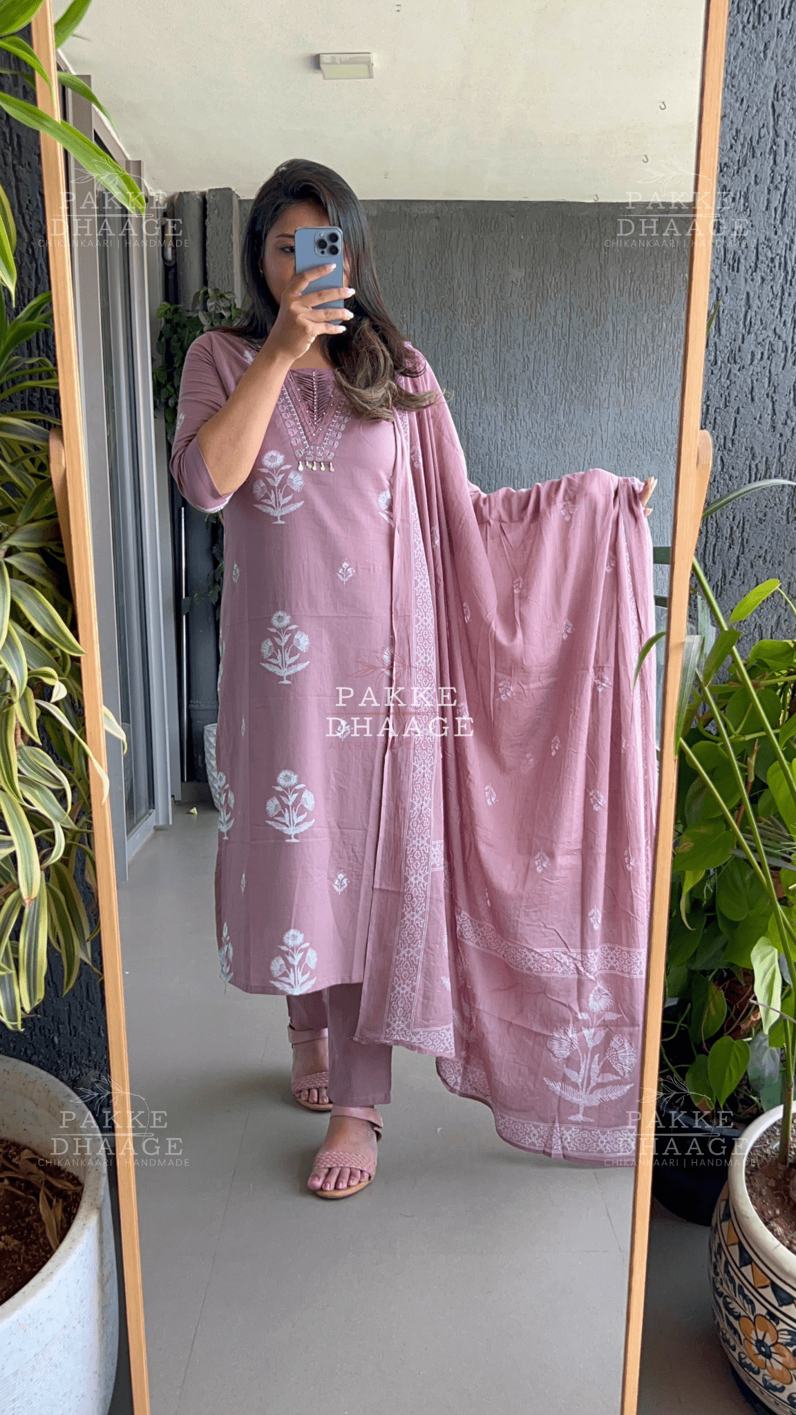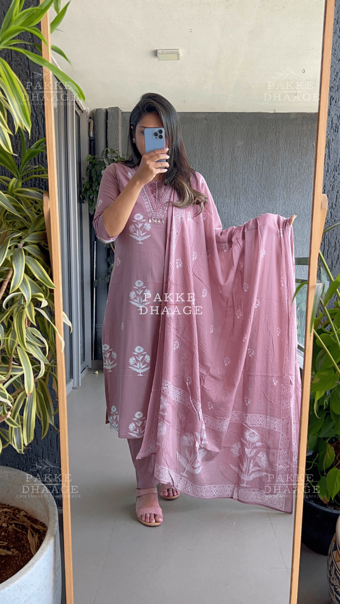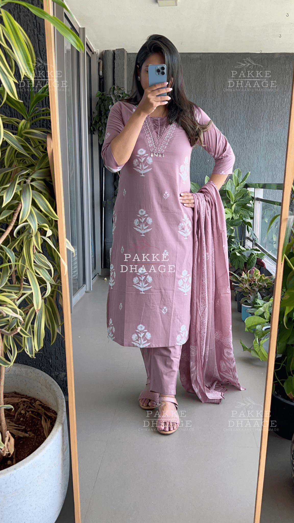 Soft on the skin, strong on style. This gorgeous muted mauve suit set in 100% pure cotton is your perfect everyday luxury - breezy, breathable, and effortlessly elegant!