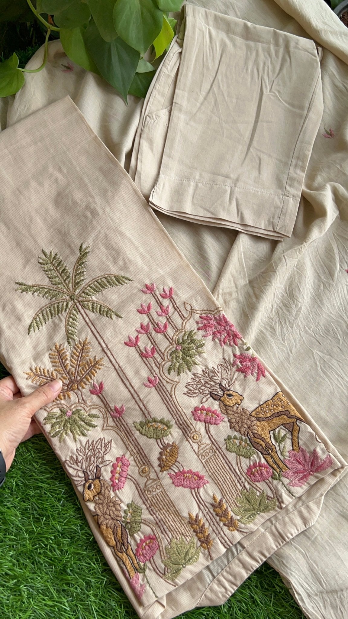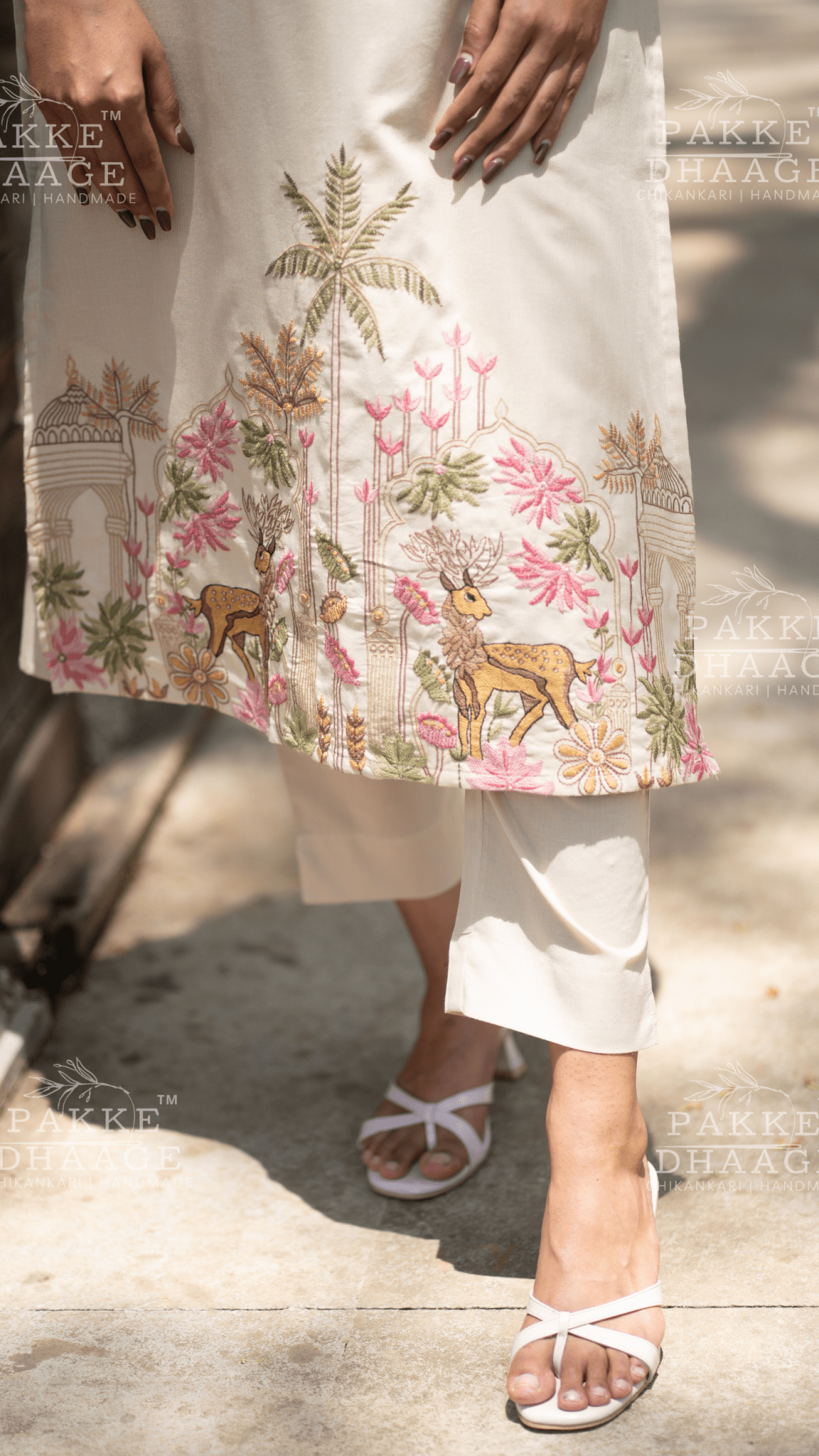 3-pc machine-embroidered suit sets comes with a matching duppatta - precise needle-work brings the motifs to life - the pinnacle of Rajasthani art forms coming to life on cloth. Set on comfortable cloth to make them the perfect all-day wear. Brilliant for office-wear, adaptable for occasions