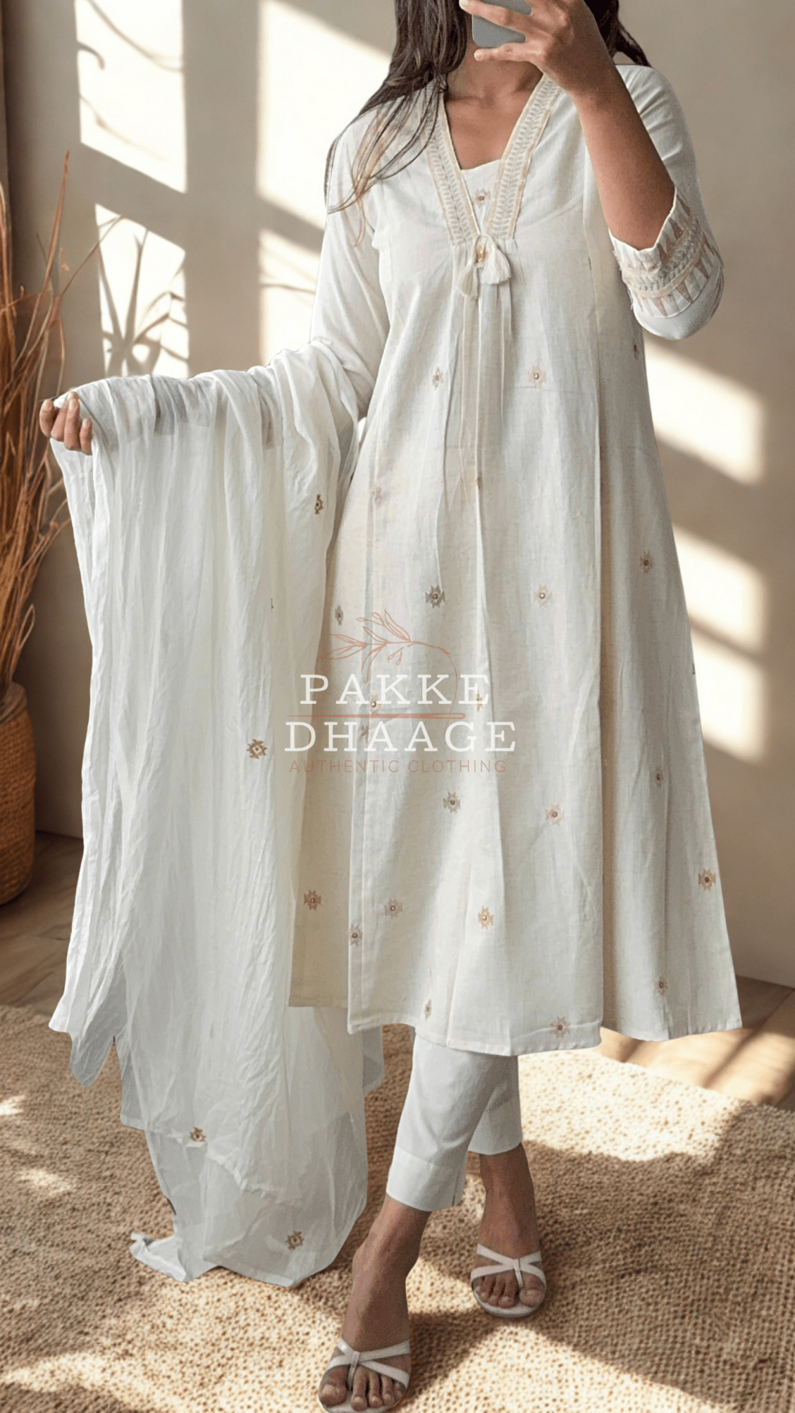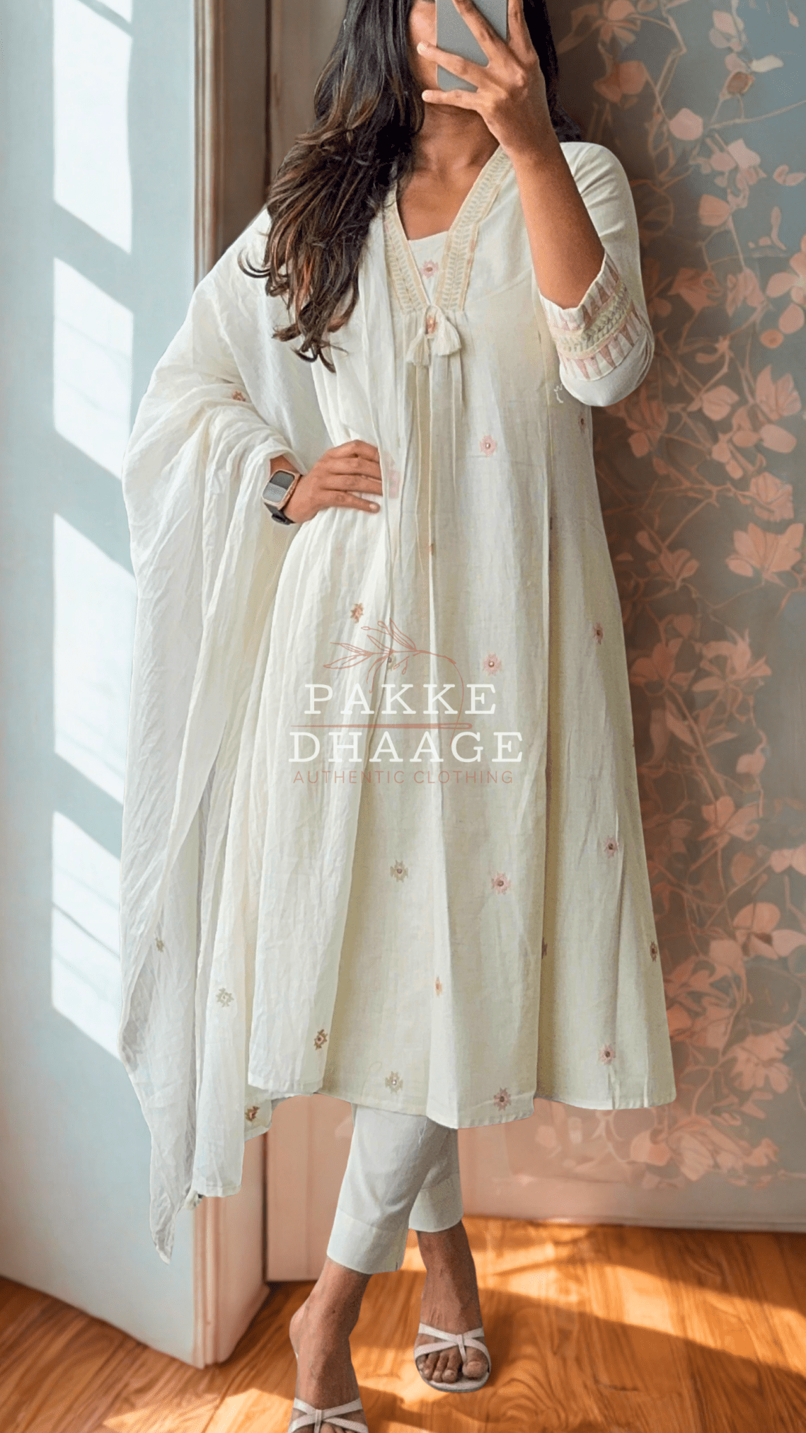 3-pc machine-embroidered suit sets - precise needle-work celebrating a minimalist restraint. Set on comfortable cloth to make them the perfect all-day wear. Brilliant for office-wear, adaptable for occasions