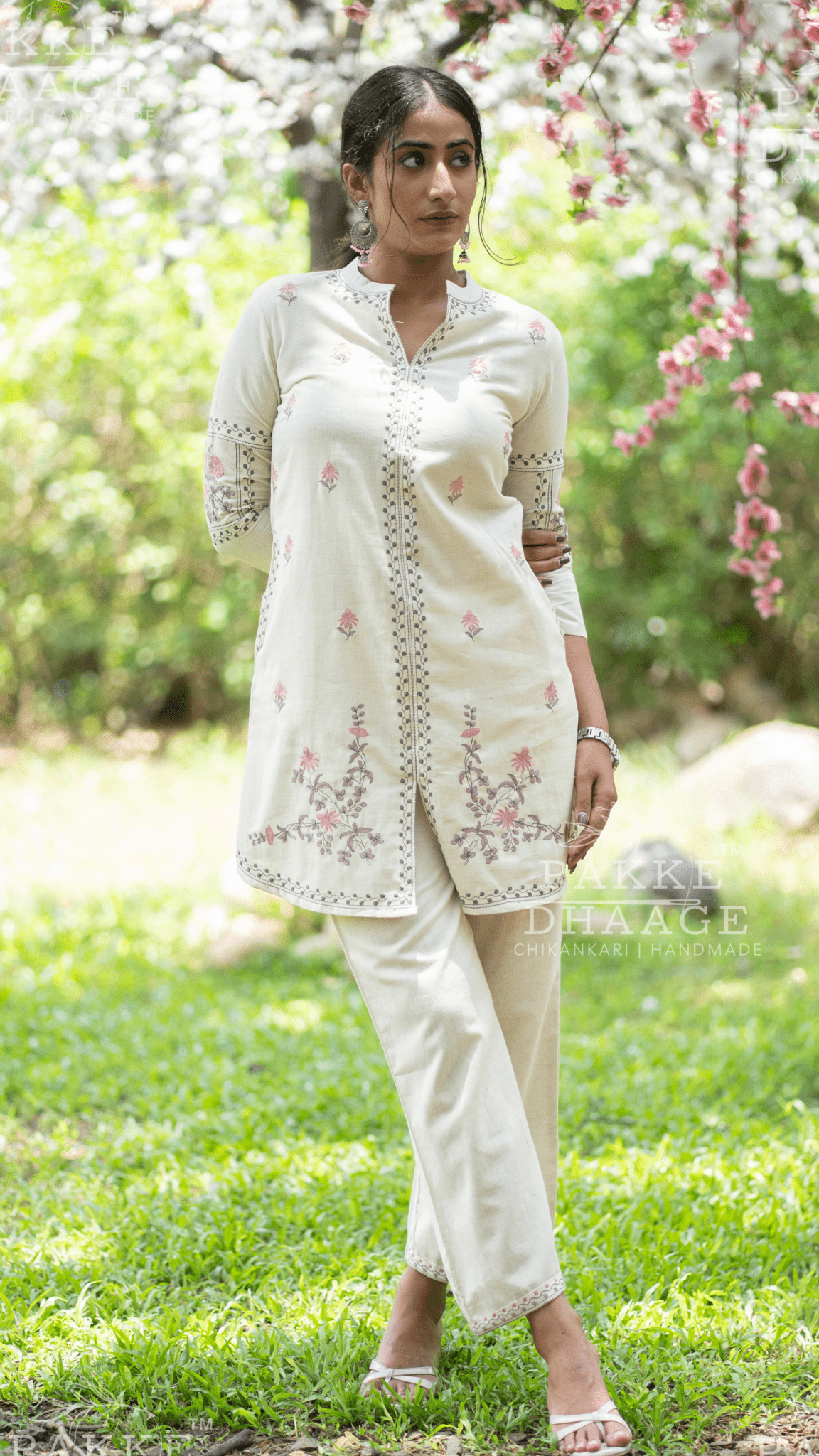 2-pc machine-embroidered sets - precise needle-work brings the motifs to life - the pinnacle of Rajasthani art forms coming to life on cloth. Set on comfortable cloth to make them the perfect all-day wear. Brilliant for office-wear, adaptable for occasions