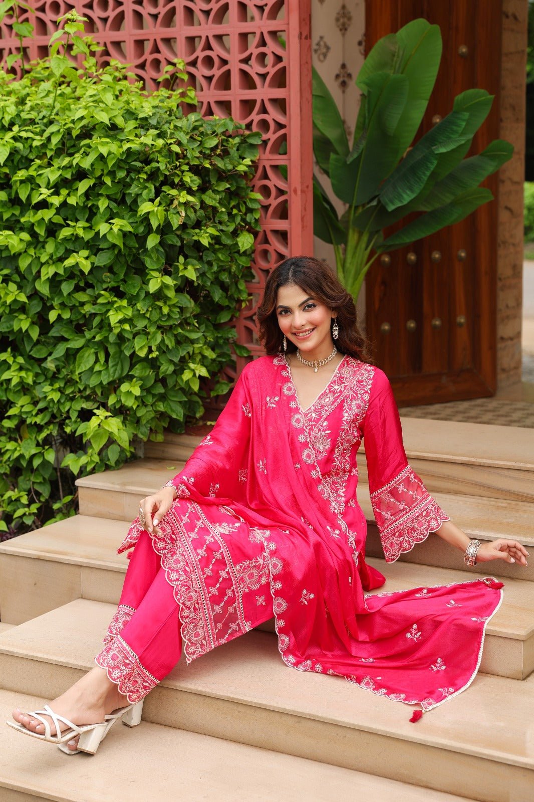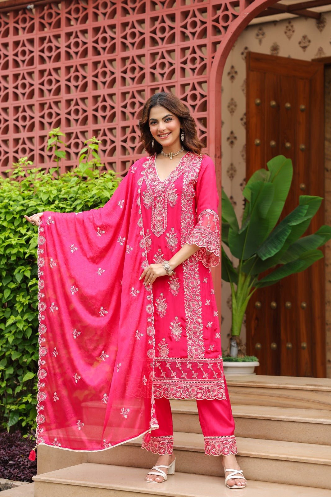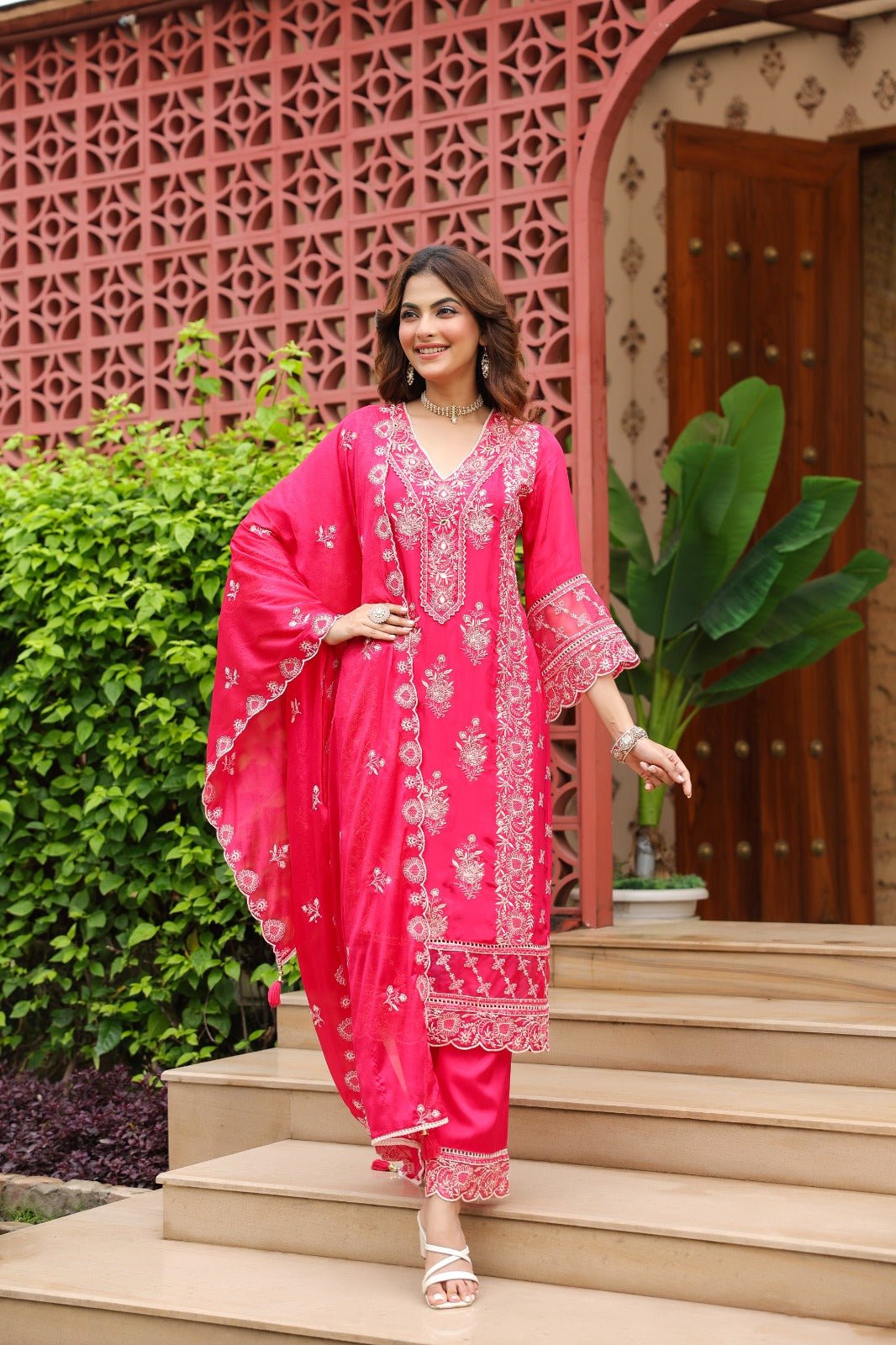 3-pc machine-embroidered suit sets - precise needle-work brings the motifs to life - on muslin organza cloth that lends just a little bit of sheen to make that understated festive look
