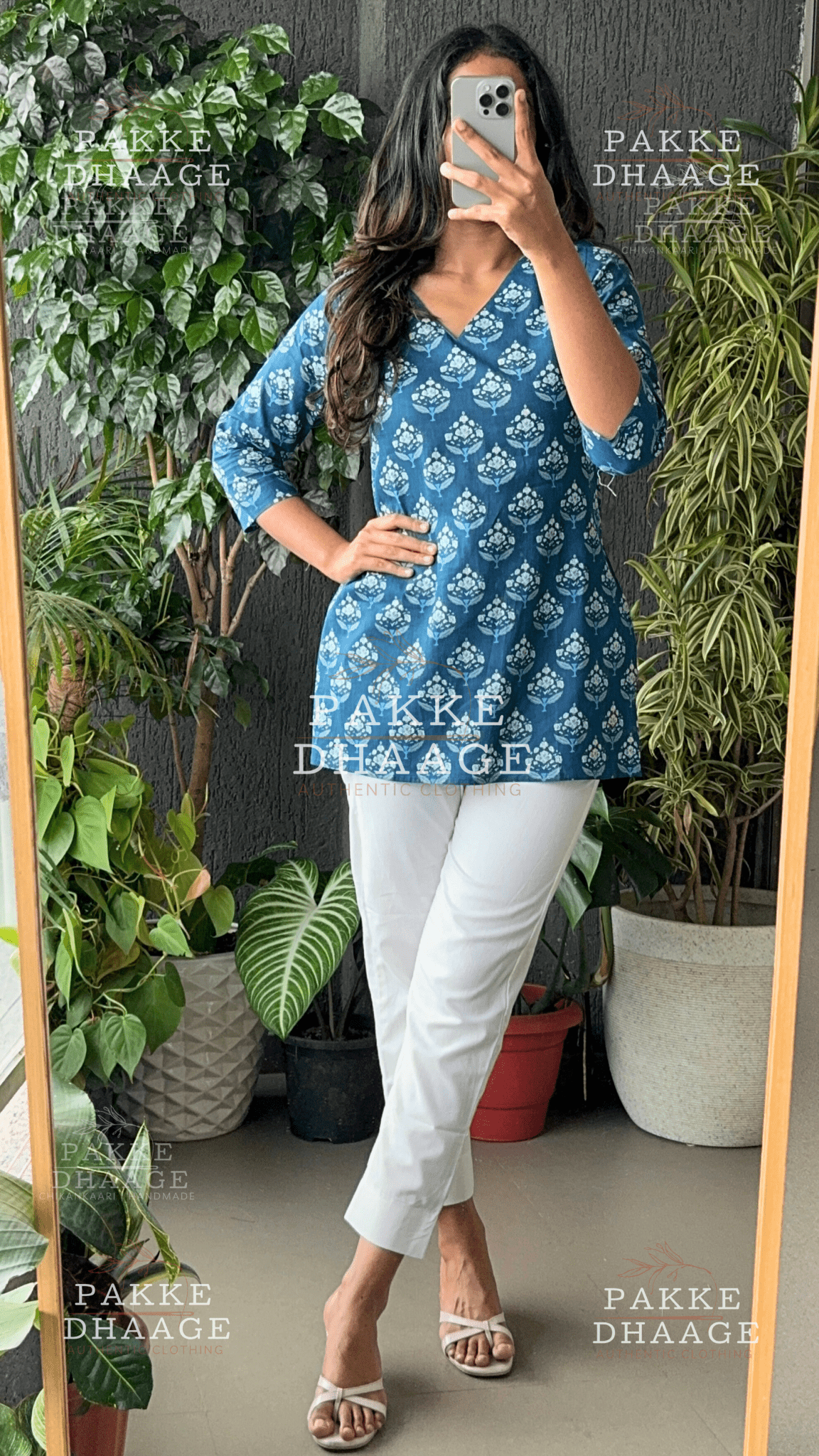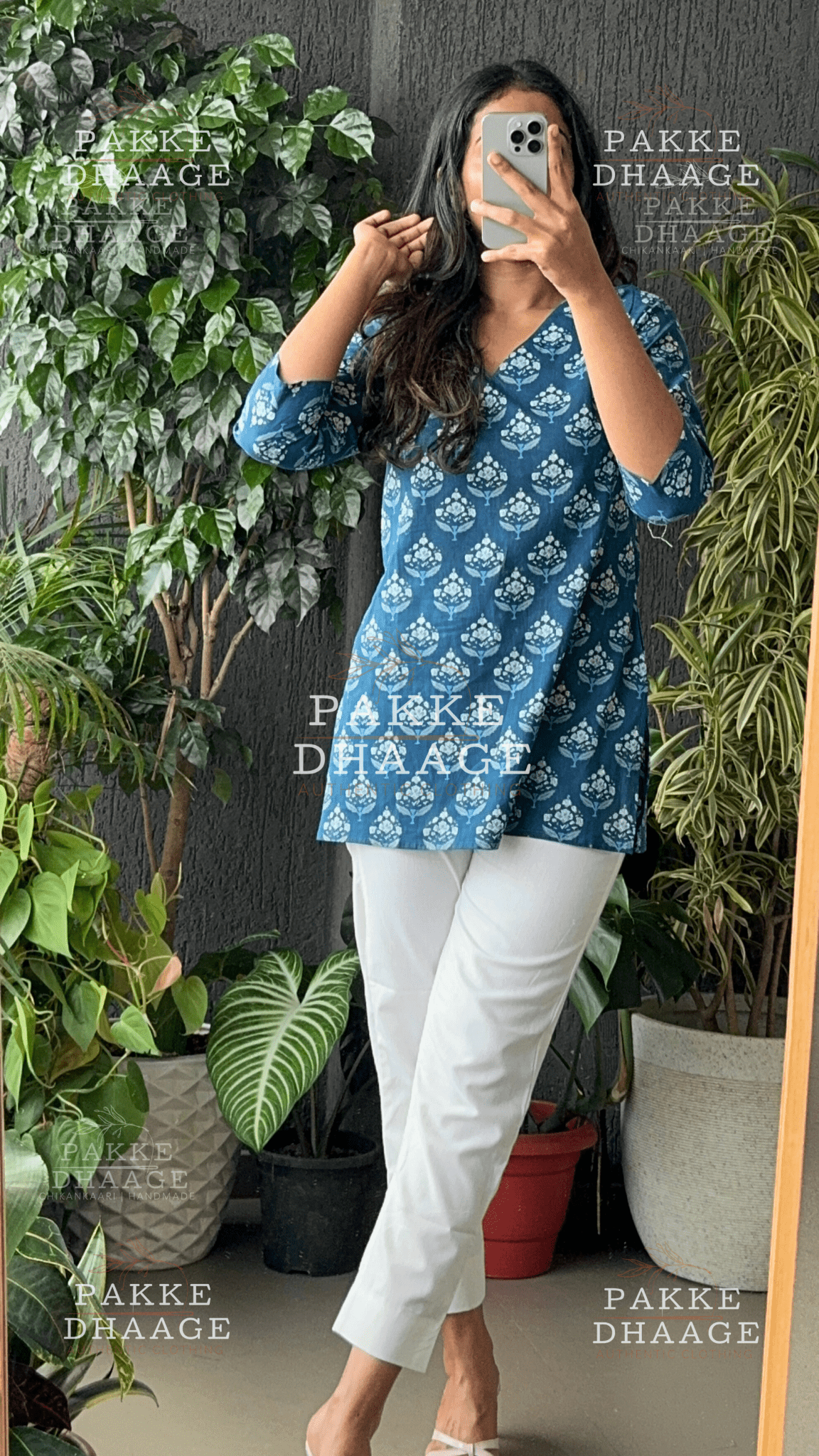 Print Poetry Pure Cotton Short Kurtis - Indigo Blue