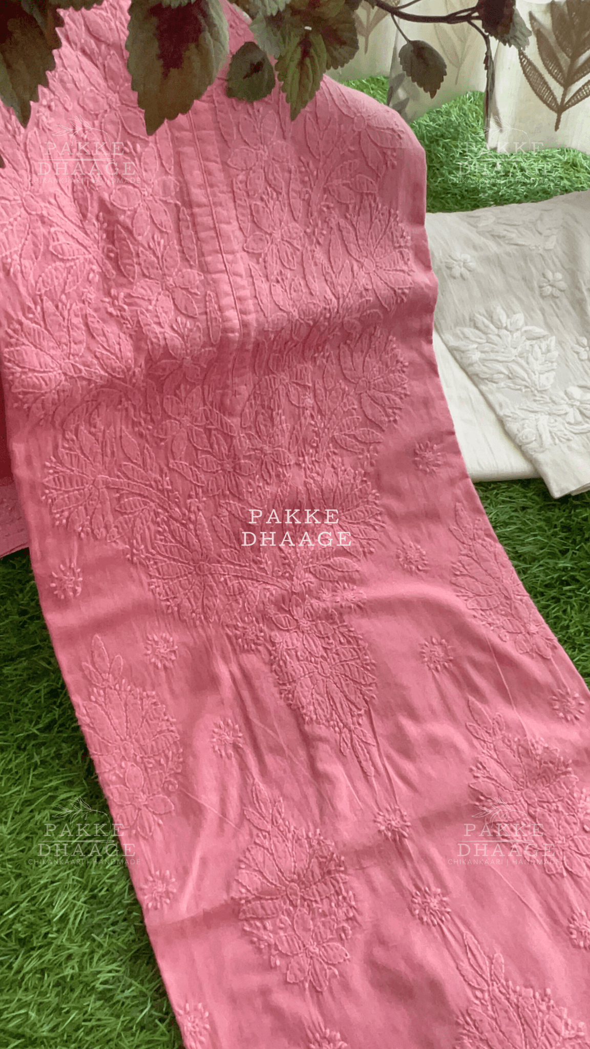 Experience the artistry of hand-embroidered chikanakri on pure mulmul kurtas, delicately rendered in pastel hues. The phanda bakhiya technique brings intricate details to life, while heavy neck embroidery, beautiful damans, and sides, and charming floral booties complete the masterpiece. A must-have for any discerning wardrobe.