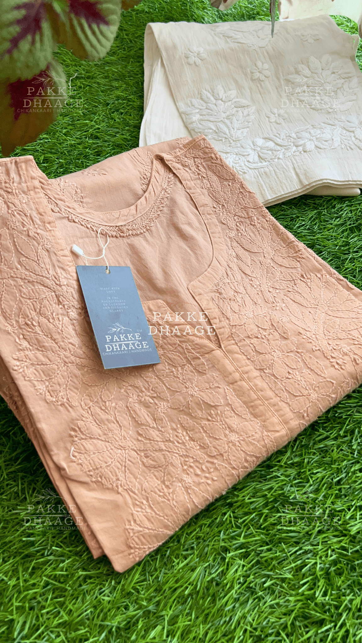 Experience the artistry of hand-embroidered chikanakri on pure mulmul kurtas, delicately rendered in pastel hues. The phanda bakhiya technique brings intricate details to life, while heavy neck embroidery, beautiful damans, and sides, and charming floral booties complete the masterpiece. A must-have for any discerning wardrobe.